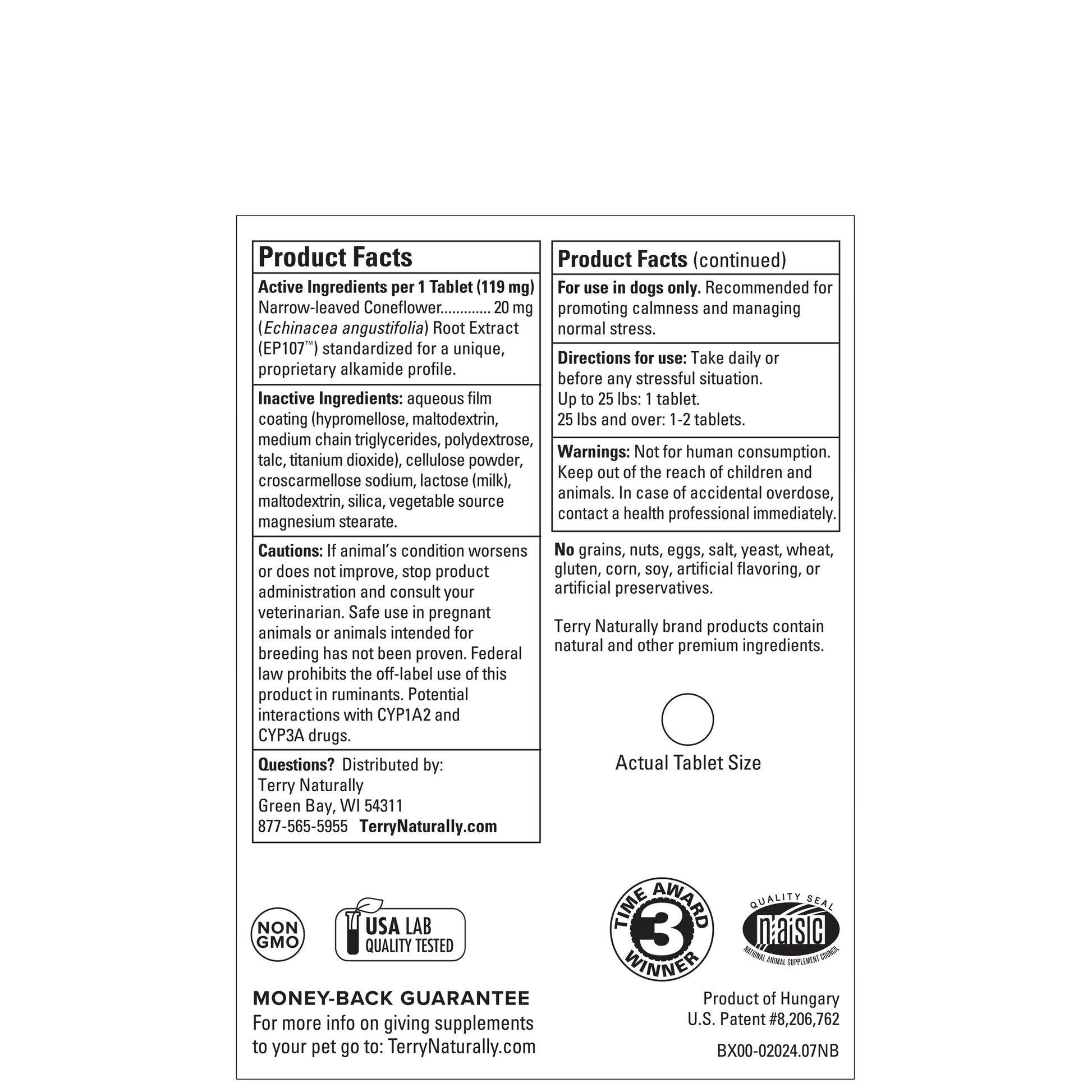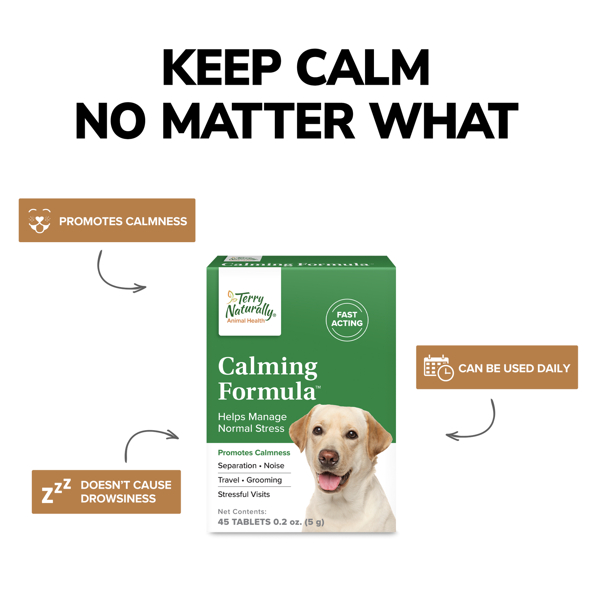 Calming Formula helps keep your pet calm and relaxed. Whether it’s a trip to the vet or groomer, separation, loud noises, kenneling, or a change to a daily routine, Calming Formula from Terry Naturally® Animal Health is the perfect answer for keeping your dog calm and in control.