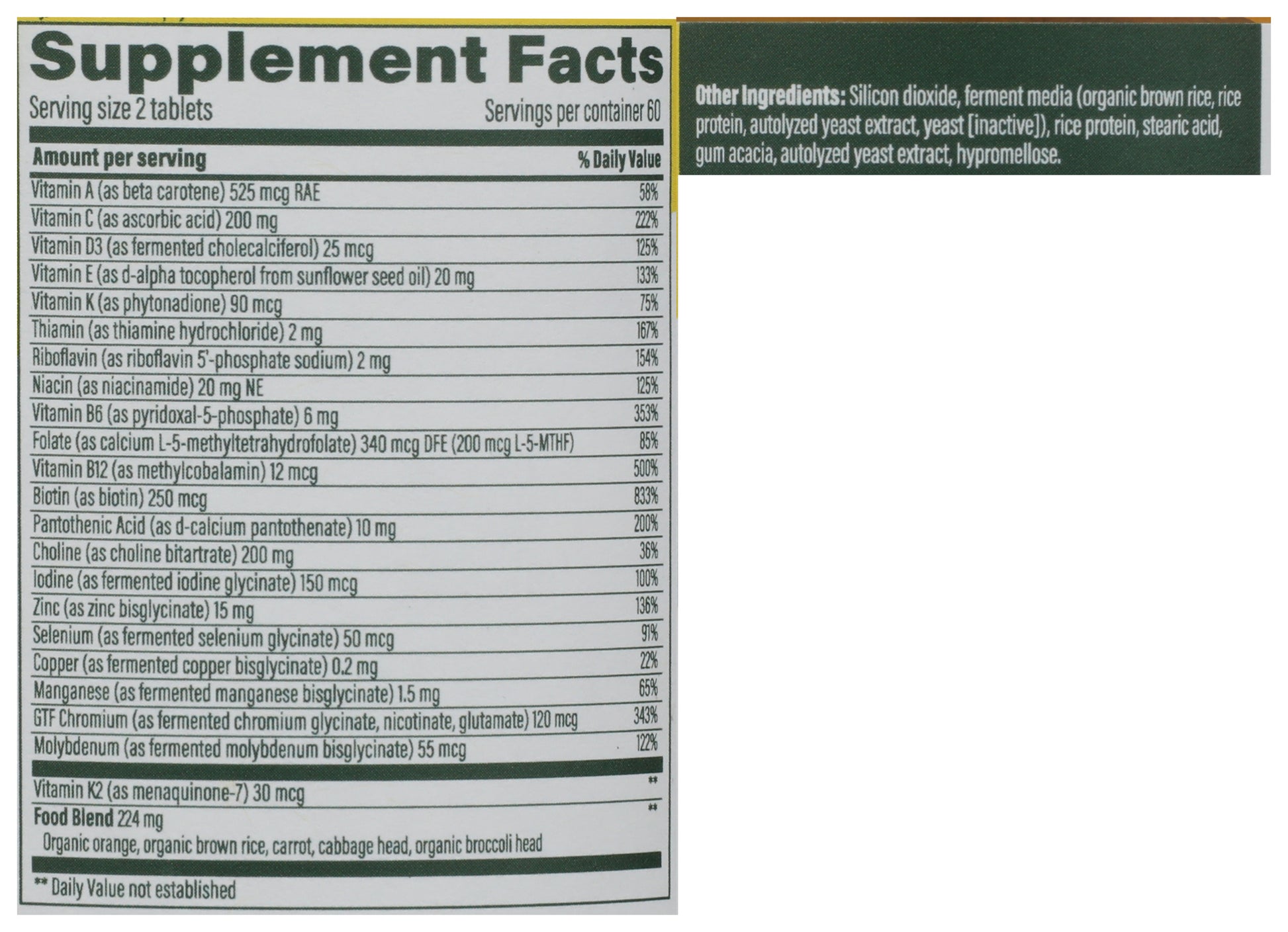 - SUGGESTED USE: ADULTS TAKE 2 TABLETS DAILY WITH A BEVERAGE. MAY BE TAKEN ANY TIME OF DAY, EVEN ON AN EMPTY STOMACH.
