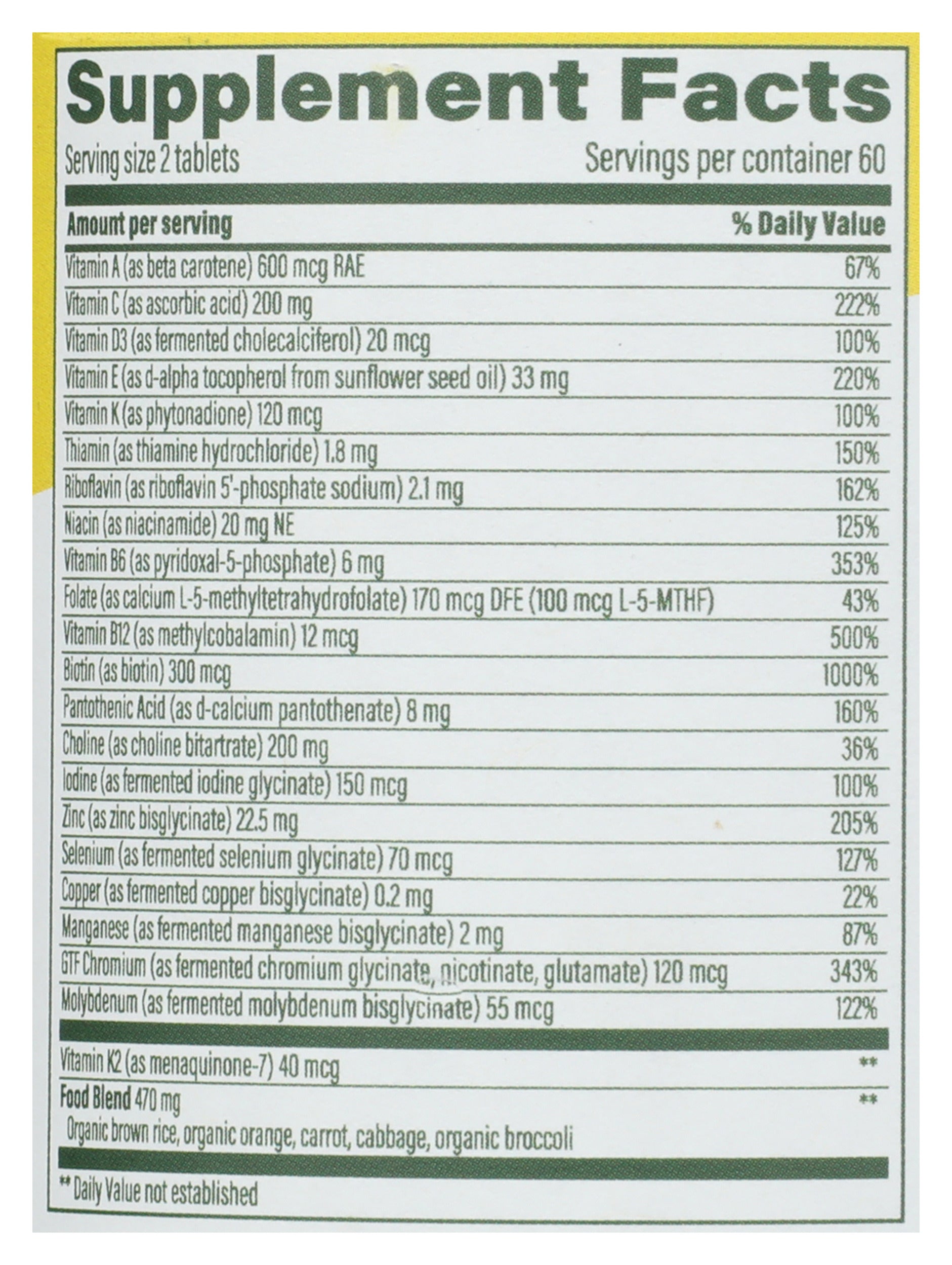 - SUGGESTED USE: ADULTS TAKE 2 TABLETS DAILY WITH A BEVERAGE. MAY BE TAKEN ANY TIME OF DAY, EVEN ON AN EMPTY STOMACH.