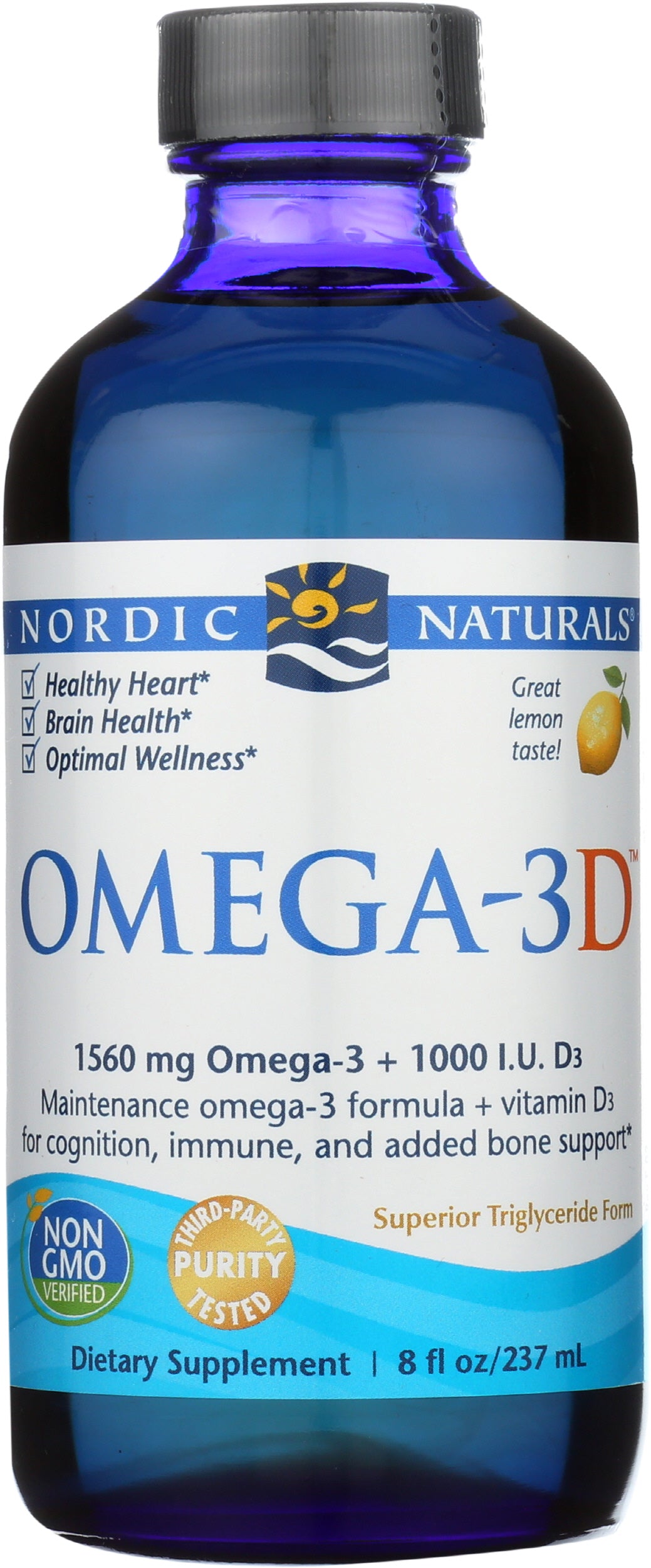 NORDIC NATURALS OMEGA-3D DIETARY SUPPLEMENT IS PACKED WITH 1,560 MG. OF OMEGA-3S AND 1,000 I.U. OF VITAMIN D3 PER SERVING TO SUPPORT IMMUNITY AND PROMOTE COGNITIVE, BRAIN, HEART AND BONE HEALTH. THIS SUPPLEMENT COMES IN THE TRIGLYCERIDE FORM FOR POTENCY AND HAS A PLEASANT LEMON FLAVOR WITHOUT ANY FISHY AFTERTASTE FOR EASY CONSUMPTION. EACH BOTTLE CONTAINS 8 FL. OZ. OF NUTRIENT-RICH SUPPLEMENT THAT'S THIRD-PARTY TESTED TO ENSURE IT'S FREE OF ENVIRONMENTAL TOXINS.