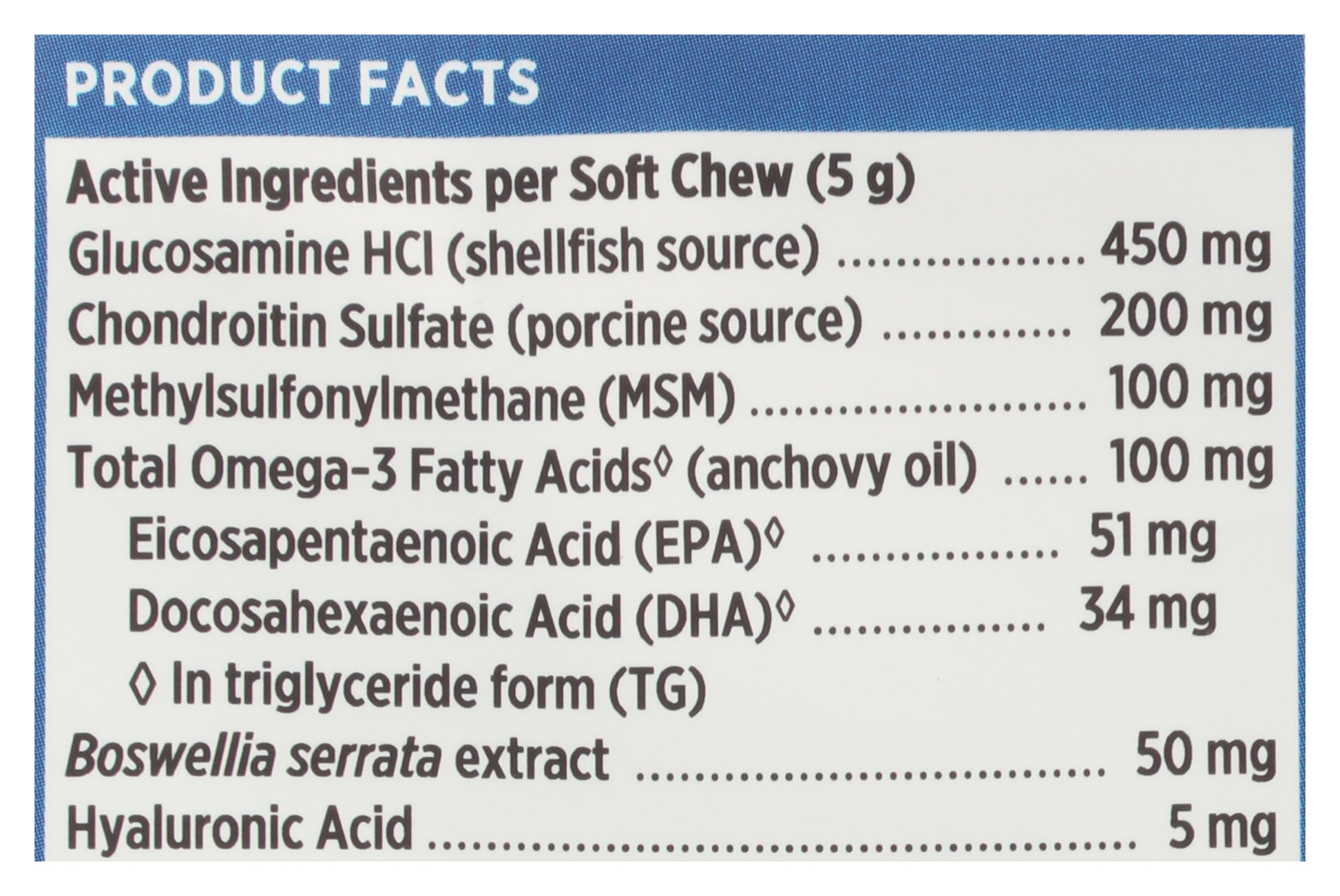- OMEGA-3S EPA AND DHA, GLUCOSAMINE, CHONDROITIN, MSM, HYALURONIC ACID, AND BOSWELLIA