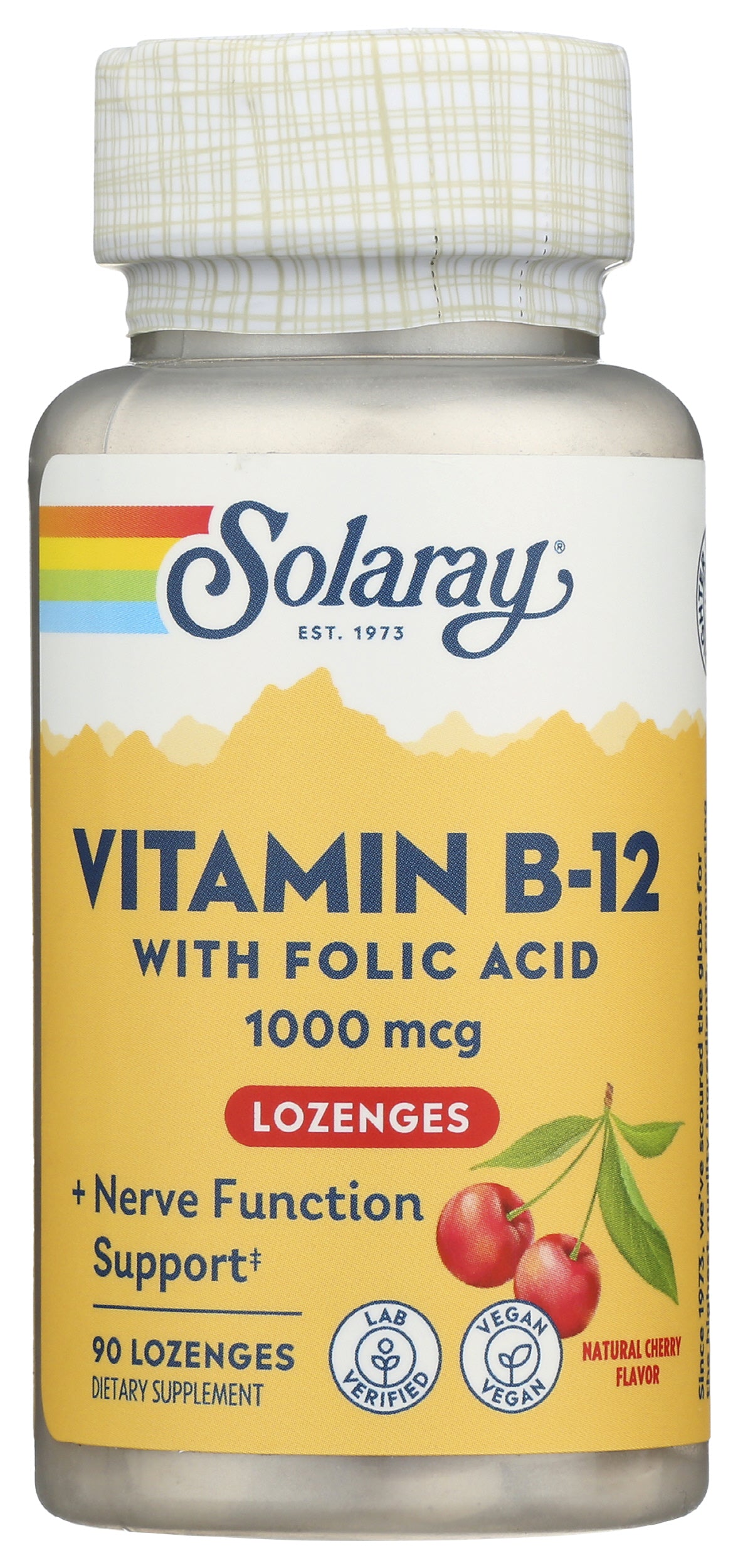 SOLARAY VITAMIN B-12 1000 MCG LOZENGES ARE A DIETARY SUPPLEMENT IN THE FORM OF NATURALLY CHERRY-FLAVORED LOZENGES. IN ADDITION TO VITAMIN B-12, EACH SINGLE-SERVING CHERRY LOZENGE PROVIDES 100% OF THE DAILY RECOMMENDED VALUE OF FOLIC ACID IN A BASE OF SORBITOL. EACH BOTTLE CONTAINS 90 VITAMIN B-12 1000 MCG LOZENGES.